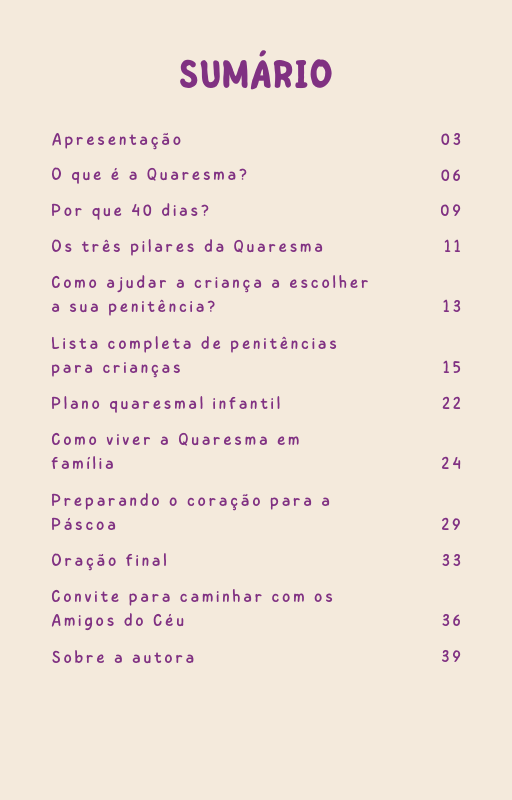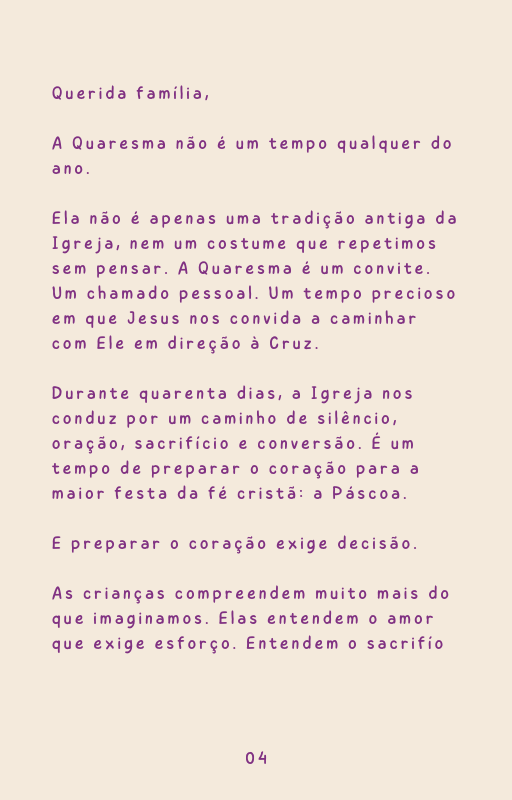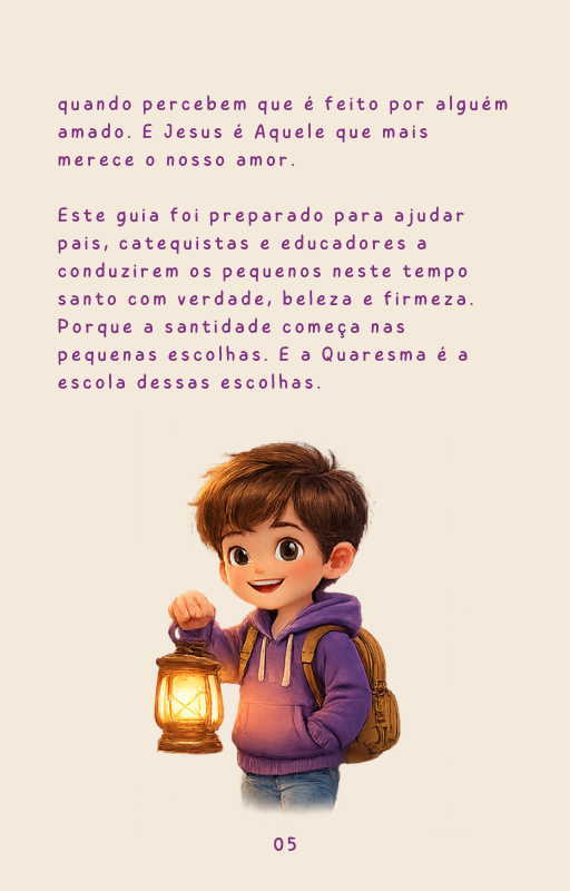 Mais do que uma coleção de atividades, este e-book conduz pais e educadores a formarem o coração das crianças durante os quarenta dias que antecedem a Páscoa — um tempo privilegiado de conversão, oração e amadurecimento espiritual.